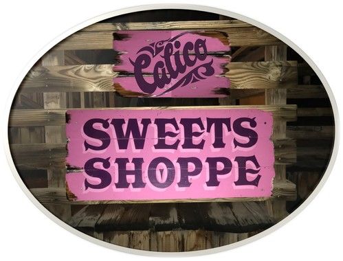 A visit to Calico is not complete without stopping in at the Calico Sweets Shoppe located on top of the hill. The walk up the hill quickly becomes well worth it as you indulge in all kinds of sweets. Our specialty is our Calico Fudge, made right on the premises and offering over twenty flavors daily. Stick with traditional Chocolate, Rocky Road or Chocolate Walnut, or taste our Cookies n' Cream, Peanut Butter, Root Beer or Sour Green Apple just to name a few. Try our line of Kick-Ass hot sauces, or cool down with an ice cream bar or one of our many old time sodas. Go back in time with an Orange Crush, Black Cherry or the delightful taste of Sarsaparilla. For those that just can not do without, it is home away from home with our very own Starbucks. Do not forget our extensive assortment of over 50 bulk candies and a large line of Jelly Belly's. We stock candy from your childhood that you haven't seen in years. We may just have what you've been missing. For your convenience, we have the only ATM in town.